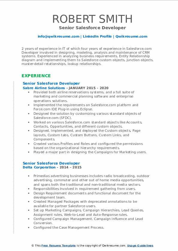 Sample Resume for Experienced Salesforce Developer Senior Salesforce Developer Resume Samples and all other pictures, designs or photos on our website are copyright of their respective owners. we get our pictures from another websites, search engines and other sources to use as an inspiration for you. please contact us if you think we are infringing copyright of your pictures using contact page. we will be very happy to help you.