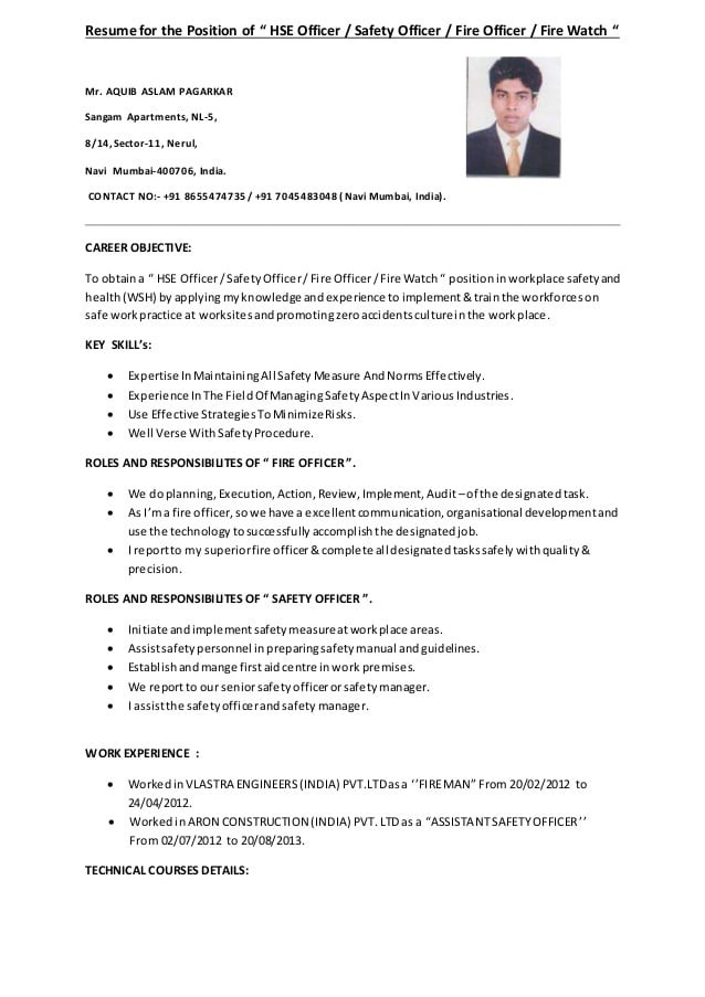 Sample Resume for Fire and Safety Officer Updated Cv Aquib Pagarkar June 2015 and all other pictures, designs or photos on our website are copyright of their respective owners. we get our pictures from another websites, search engines and other sources to use as an inspiration for you. please contact us if you think we are infringing copyright of your pictures using contact page. we will be very happy to help you.