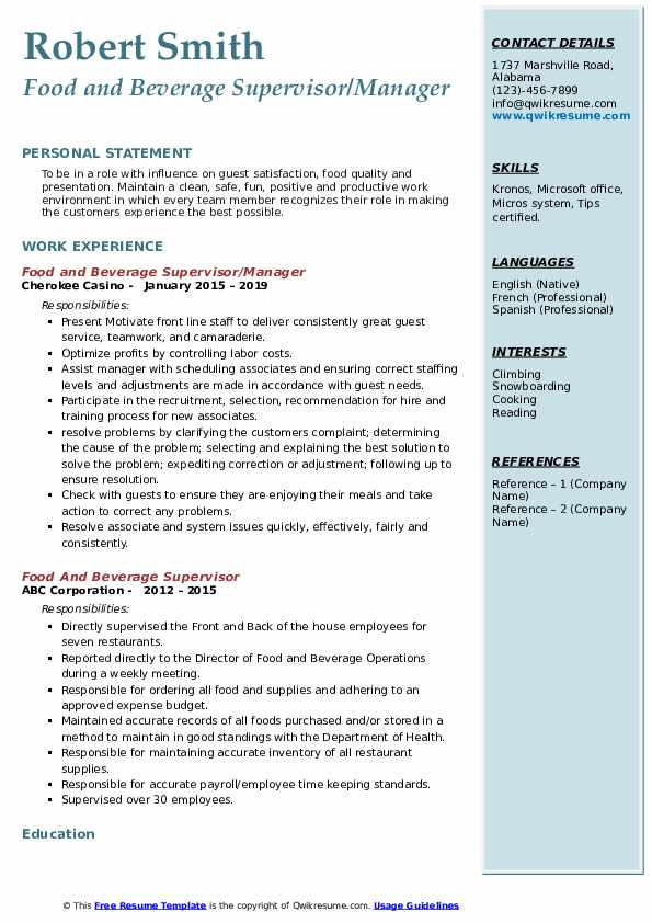 Sample Resume for Food and Beverage Supervisor Food and Beverage Supervisor Resume Samples and all other pictures, designs or photos on our website are copyright of their respective owners. we get our pictures from another websites, search engines and other sources to use as an inspiration for you. please contact us if you think we are infringing copyright of your pictures using contact page. we will be very happy to help you.