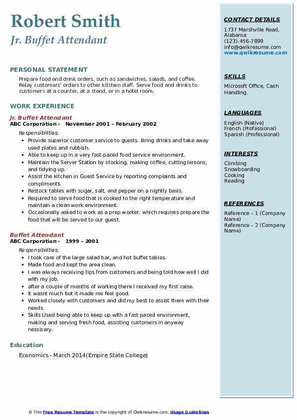 Sample Resume for Food Counter attendant Buffet attendant Resume Samples is related to Resume Samples. if you looking for Sample Resume for Food Counter attendant Buffet attendant Resume Samples and you feel this is useful, you must share this image to your friends. we also hope this image of Sample Resume for Food Counter attendant Buffet attendant Resume Samples can be useful for you. we will always give new source of image for you