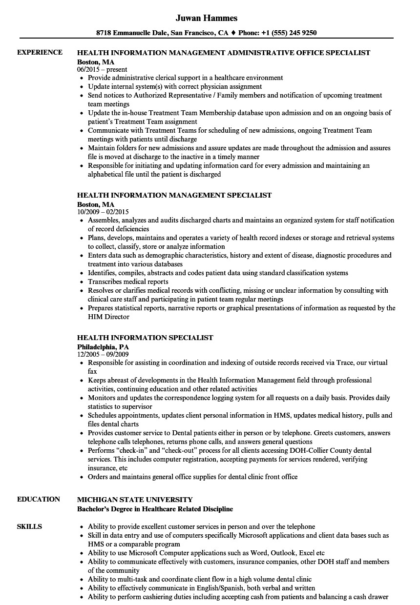 Sample Resume for Health Information Management Health Information Specialist Resume Samples and all other pictures, designs or photos on our website are copyright of their respective owners. we get our pictures from another websites, search engines and other sources to use as an inspiration for you. please contact us if you think we are infringing copyright of your pictures using contact page. we will be very happy to help you.