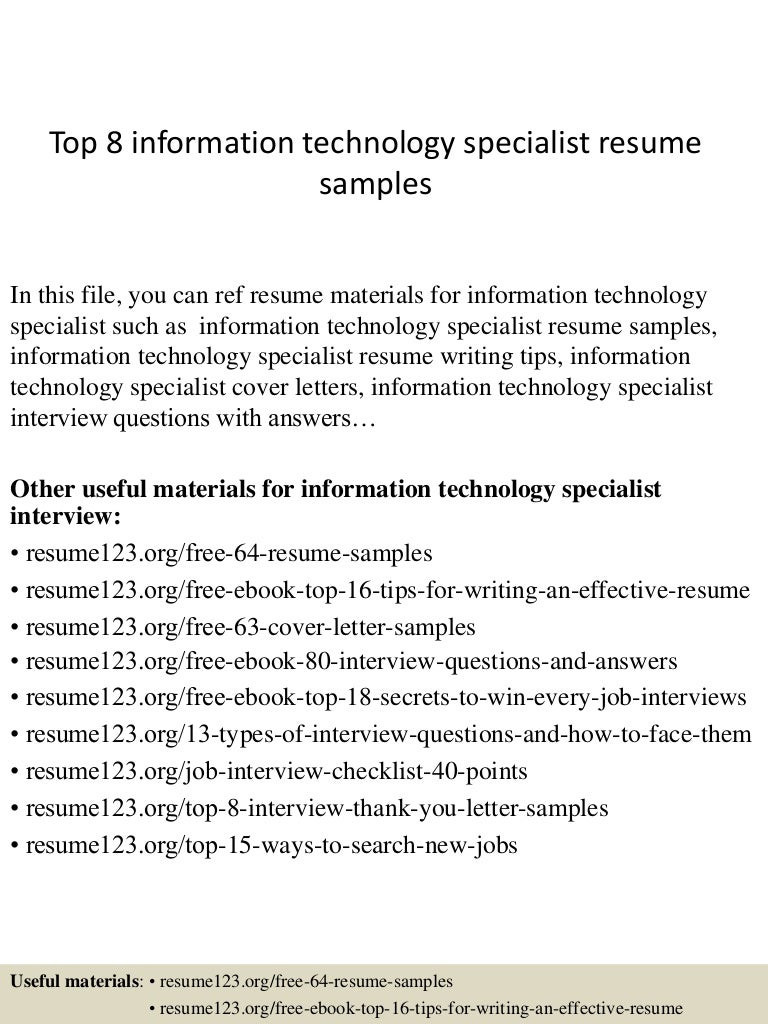 Sample Resume for Information Technology Specialist top 8 Information Technology Specialist Resume Samples and all other pictures, designs or photos on our website are copyright of their respective owners. we get our pictures from another websites, search engines and other sources to use as an inspiration for you. please contact us if you think we are infringing copyright of your pictures using contact page. we will be very happy to help you.