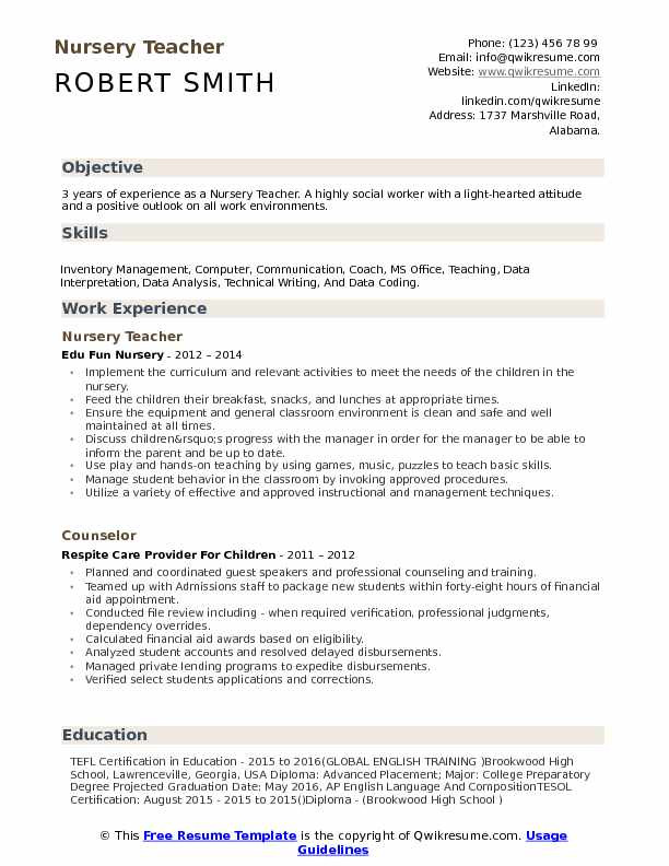 Sample Resume for Nursery School Teacher Nursery Teacher Resume Samples and all other pictures, designs or photos on our website are copyright of their respective owners. we get our pictures from another websites, search engines and other sources to use as an inspiration for you. please contact us if you think we are infringing copyright of your pictures using contact page. we will be very happy to help you.
