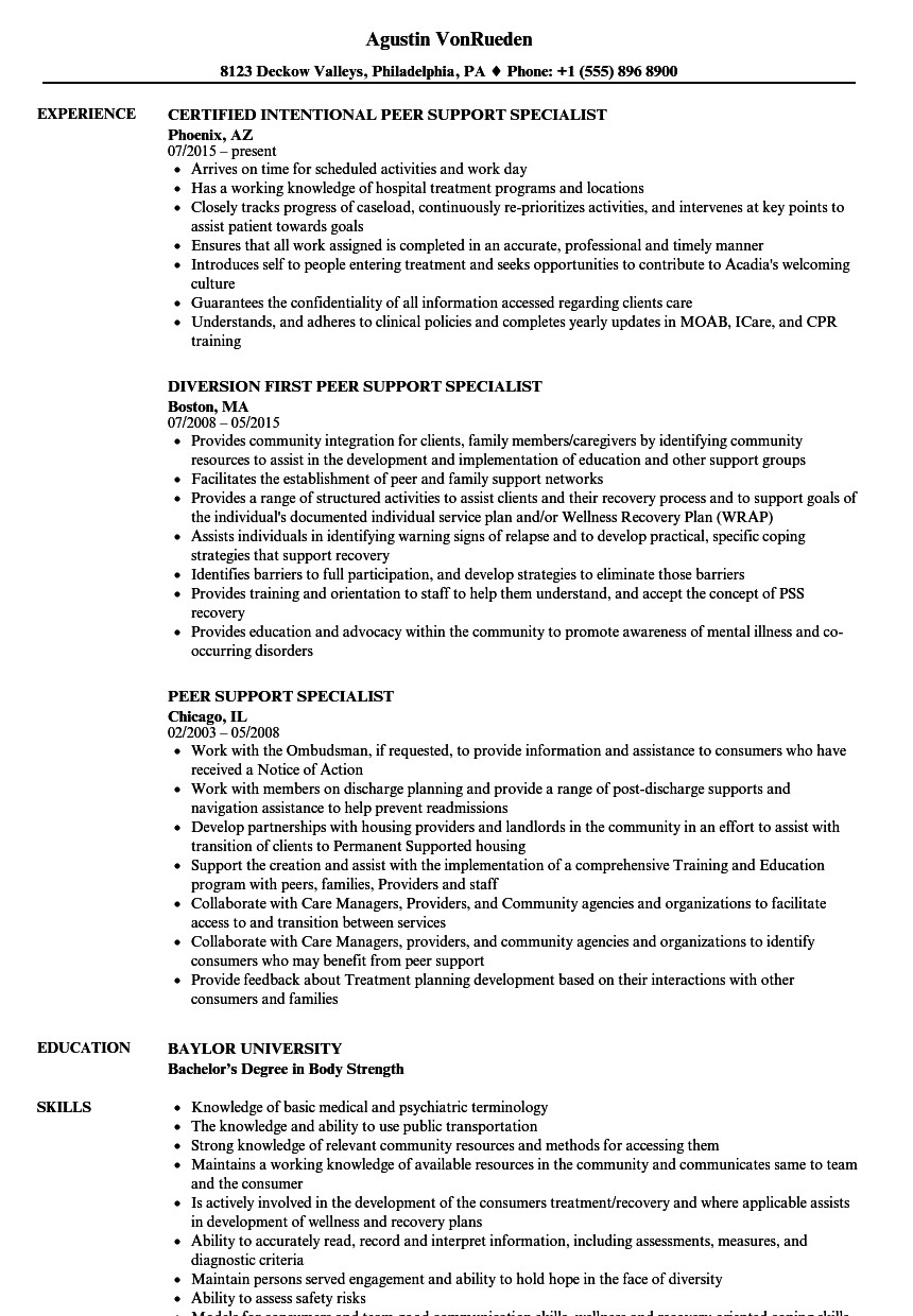 Sample Resume for Peer Support Specialist Peer Support Specialist Resume Samples and all other pictures, designs or photos on our website are copyright of their respective owners. we get our pictures from another websites, search engines and other sources to use as an inspiration for you. please contact us if you think we are infringing copyright of your pictures using contact page. we will be very happy to help you.