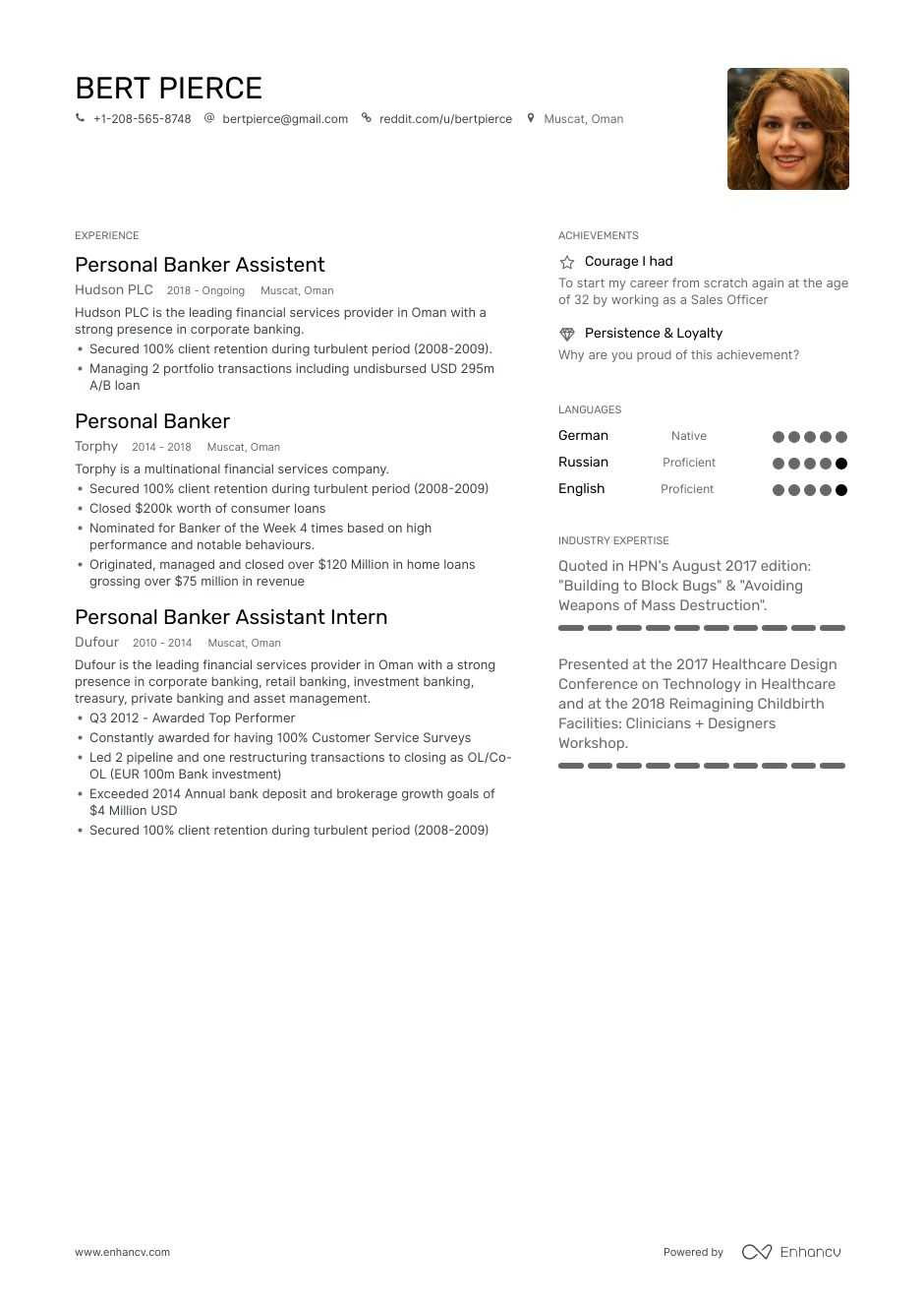 Sample Resume for Personal Banker Position Personal Banker Resume Sample One – Good Resume Examples and all other pictures, designs or photos on our website are copyright of their respective owners. we get our pictures from another websites, search engines and other sources to use as an inspiration for you. please contact us if you think we are infringing copyright of your pictures using contact page. we will be very happy to help you.