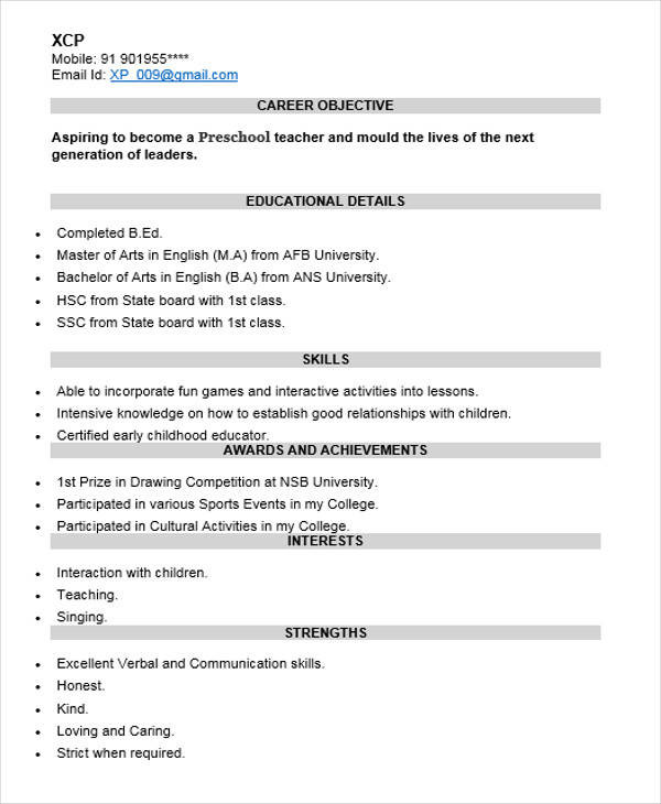 6 photos of the Sample Resume for Preschool Teacher Fresher