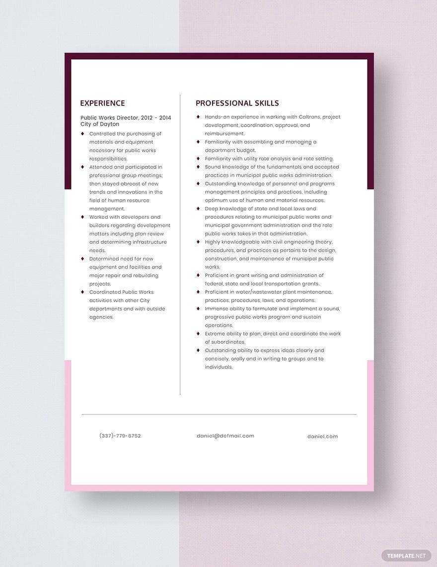 Sample Resume for Public Works Director Free Free Public Works Director Resume Template – Word, Apple … and all other pictures, designs or photos on our website are copyright of their respective owners. we get our pictures from another websites, search engines and other sources to use as an inspiration for you. please contact us if you think we are infringing copyright of your pictures using contact page. we will be very happy to help you.