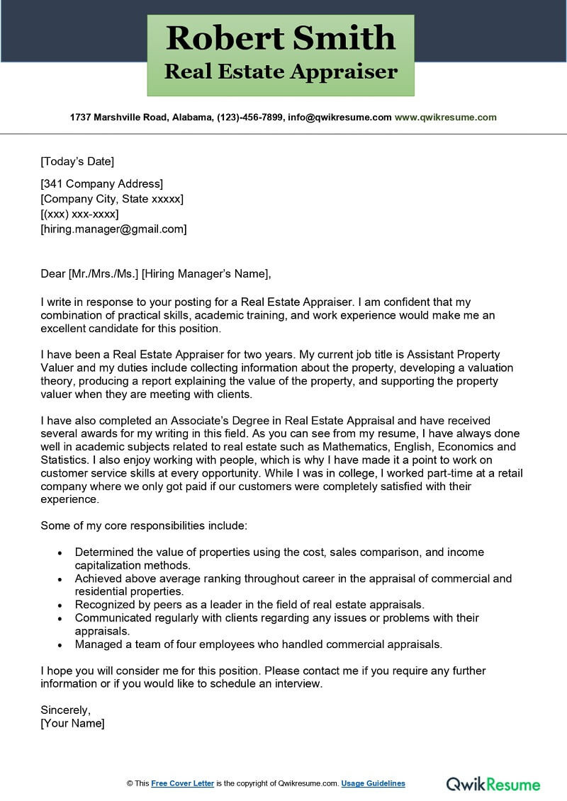 Sample Resume for Real Estate Appraiser Real Estate Appraiser Cover Letter Examples – Qwikresume and all other pictures, designs or photos on our website are copyright of their respective owners. we get our pictures from another websites, search engines and other sources to use as an inspiration for you. please contact us if you think we are infringing copyright of your pictures using contact page. we will be very happy to help you.