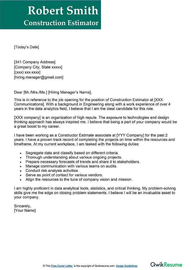 Sample Resume for Senior Residential Estimator Estimator Cover Letter Examples – Qwikresume and all other pictures, designs or photos on our website are copyright of their respective owners. we get our pictures from another websites, search engines and other sources to use as an inspiration for you. please contact us if you think we are infringing copyright of your pictures using contact page. we will be very happy to help you.