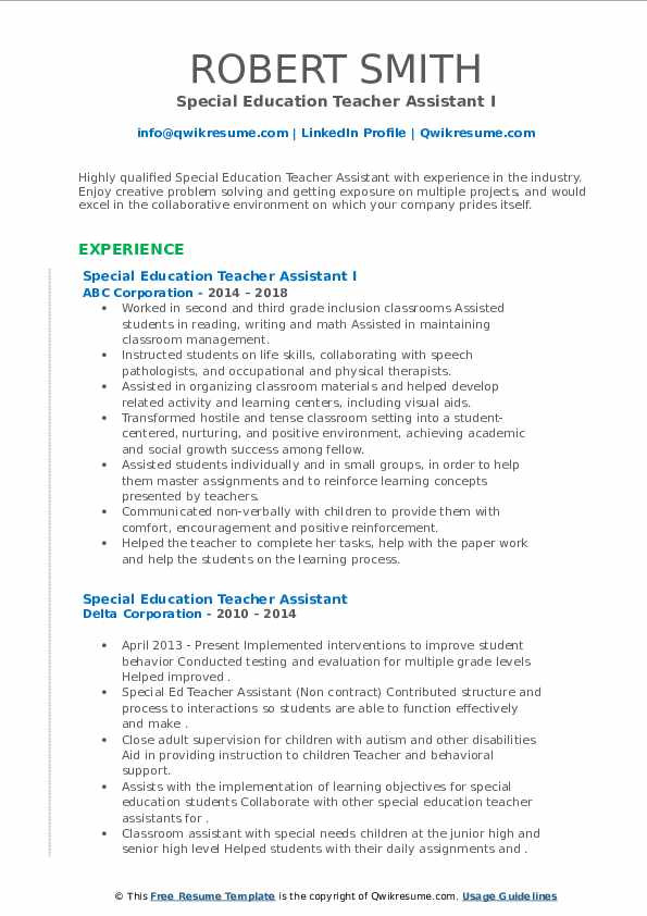 Sample Resume for Special Education Teacher assistant Special Education Teacher assistant Resume Samples and all other pictures, designs or photos on our website are copyright of their respective owners. we get our pictures from another websites, search engines and other sources to use as an inspiration for you. please contact us if you think we are infringing copyright of your pictures using contact page. we will be very happy to help you.