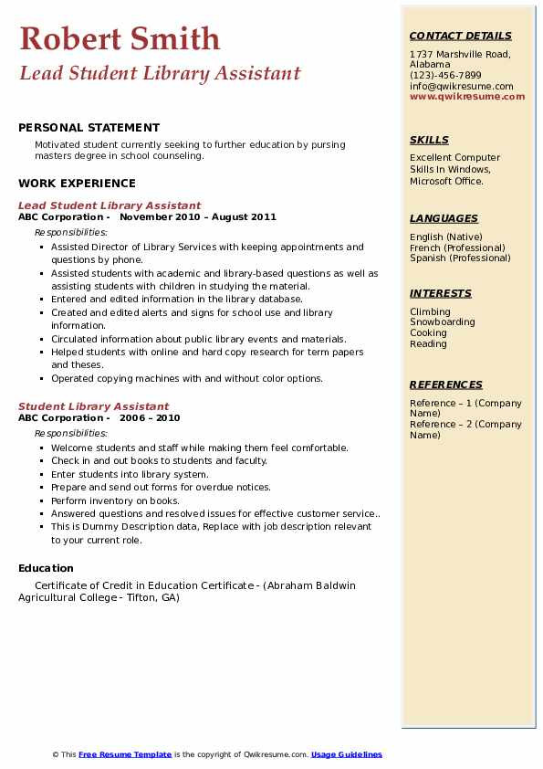 Sample Resume for Student Library assistant Student Library assistant Resume Samples is related to Resume Samples. if you looking for Sample Resume for Student Library assistant Student Library assistant Resume Samples and you feel this is useful, you must share this image to your friends. we also hope this image of Sample Resume for Student Library assistant Student Library assistant Resume Samples can be useful for you. we will always give new source of image for you