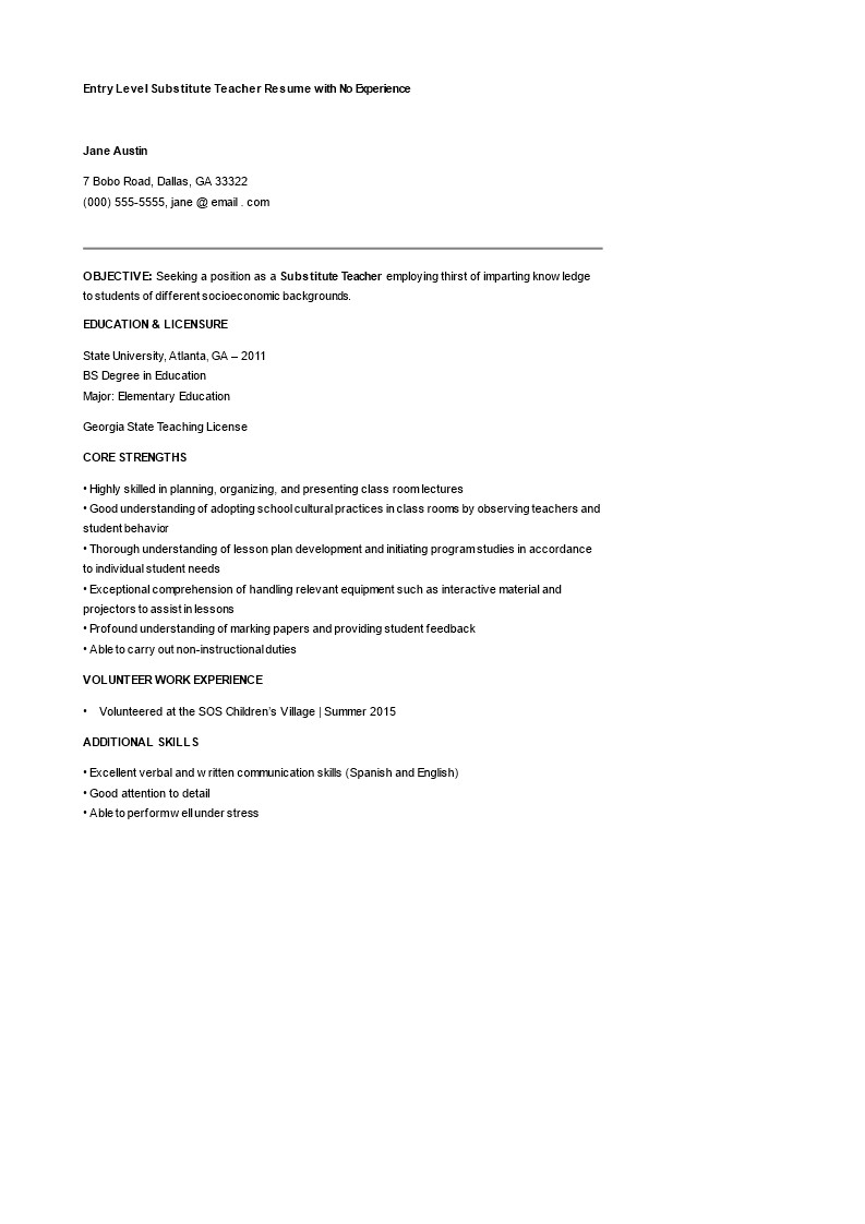 Sample Resume for Substitute Teacher with No Experience Entry Level Substitute Teacher Resume with No Experience and all other pictures, designs or photos on our website are copyright of their respective owners. we get our pictures from another websites, search engines and other sources to use as an inspiration for you. please contact us if you think we are infringing copyright of your pictures using contact page. we will be very happy to help you.