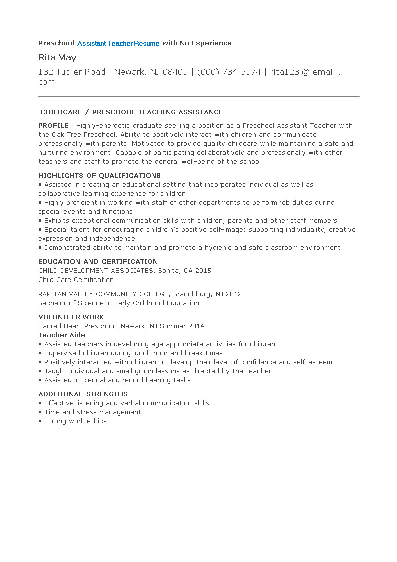 Sample Resume for Teaching Position with No Experience Preschool assistant Teacher Resume with No Experience and all other pictures, designs or photos on our website are copyright of their respective owners. we get our pictures from another websites, search engines and other sources to use as an inspiration for you. please contact us if you think we are infringing copyright of your pictures using contact page. we will be very happy to help you.