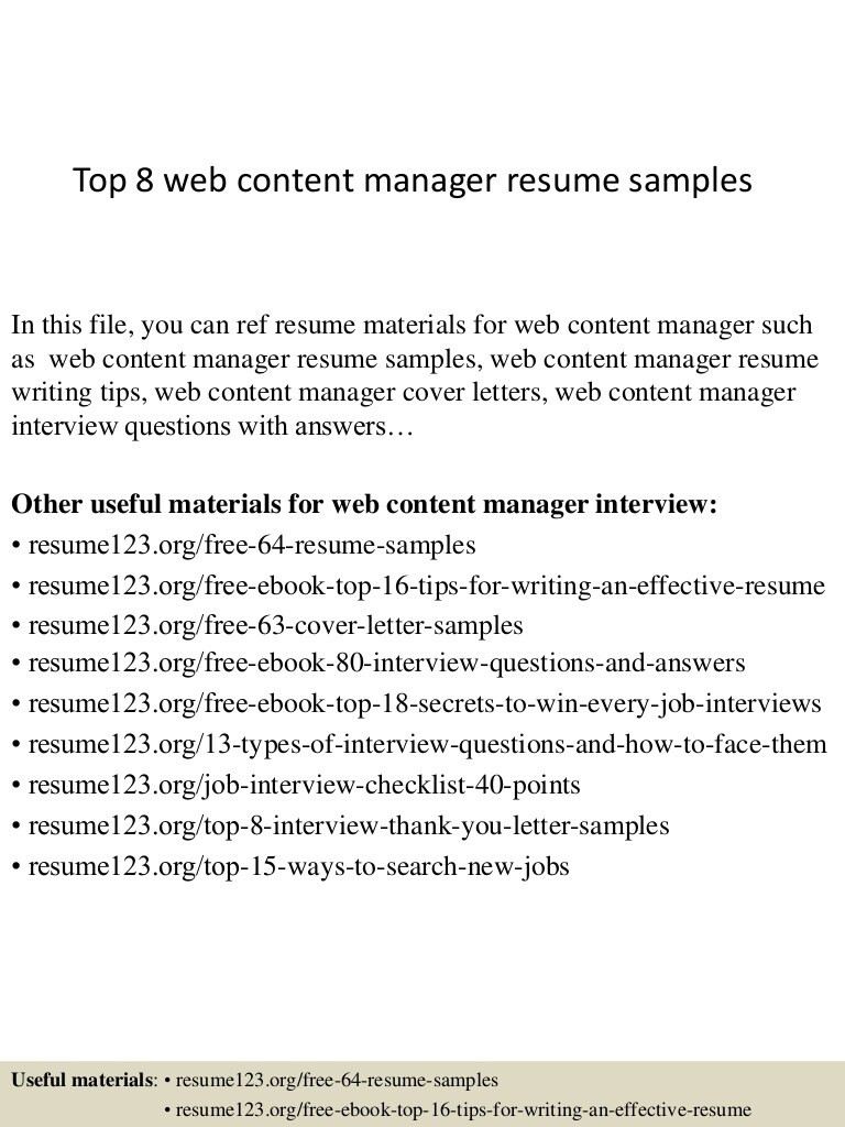 Sample Resume for Web Content Manager top 8 Web Content Manager Resume Samples and all other pictures, designs or photos on our website are copyright of their respective owners. we get our pictures from another websites, search engines and other sources to use as an inspiration for you. please contact us if you think we are infringing copyright of your pictures using contact page. we will be very happy to help you.