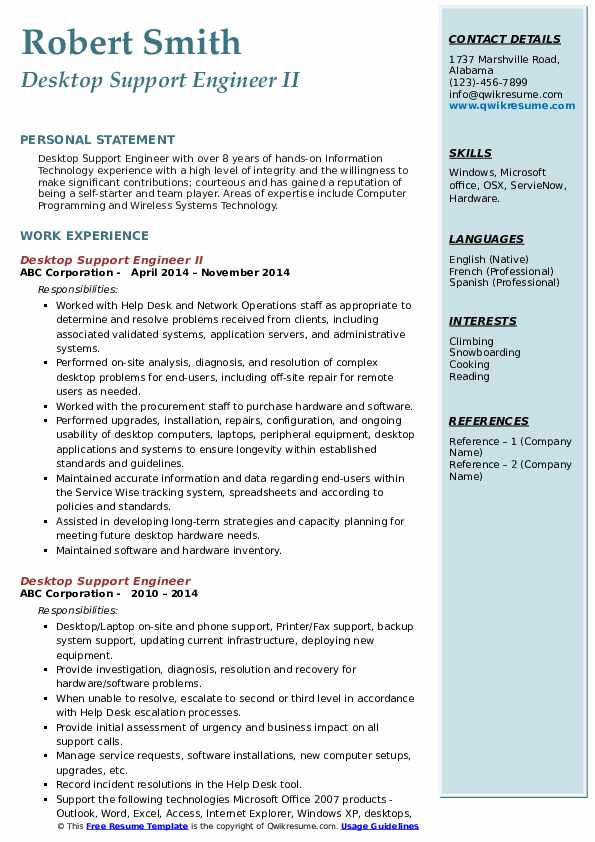 Sample Resume format for Desktop Support Engineer Desktop Support Engineer Resume Samples and all other pictures, designs or photos on our website are copyright of their respective owners. we get our pictures from another websites, search engines and other sources to use as an inspiration for you. please contact us if you think we are infringing copyright of your pictures using contact page. we will be very happy to help you.