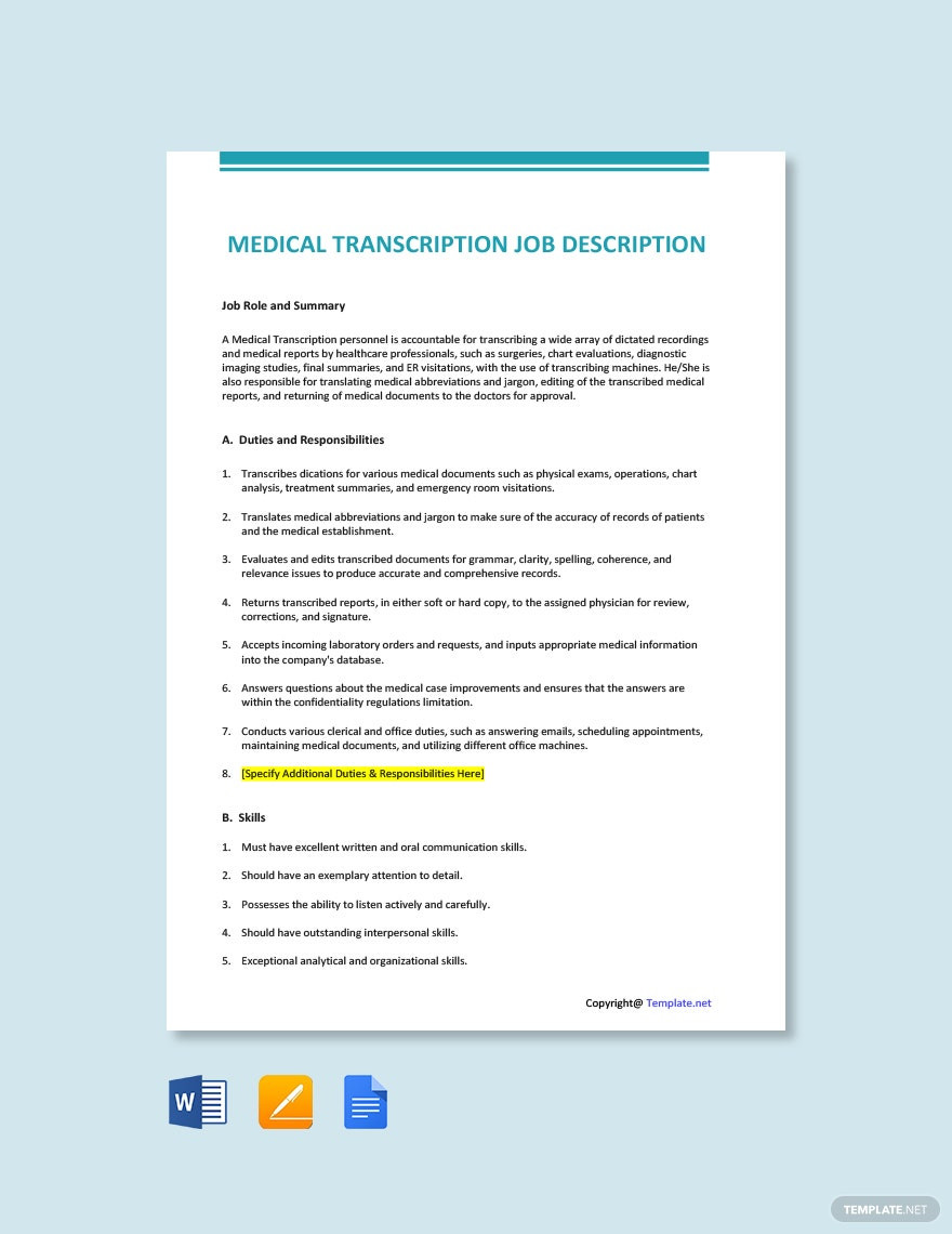 Sample Resume Objectives for Medical Transcriptionist Medical Transcription Job Description Template – Google Docs … and all other pictures, designs or photos on our website are copyright of their respective owners. we get our pictures from another websites, search engines and other sources to use as an inspiration for you. please contact us if you think we are infringing copyright of your pictures using contact page. we will be very happy to help you.