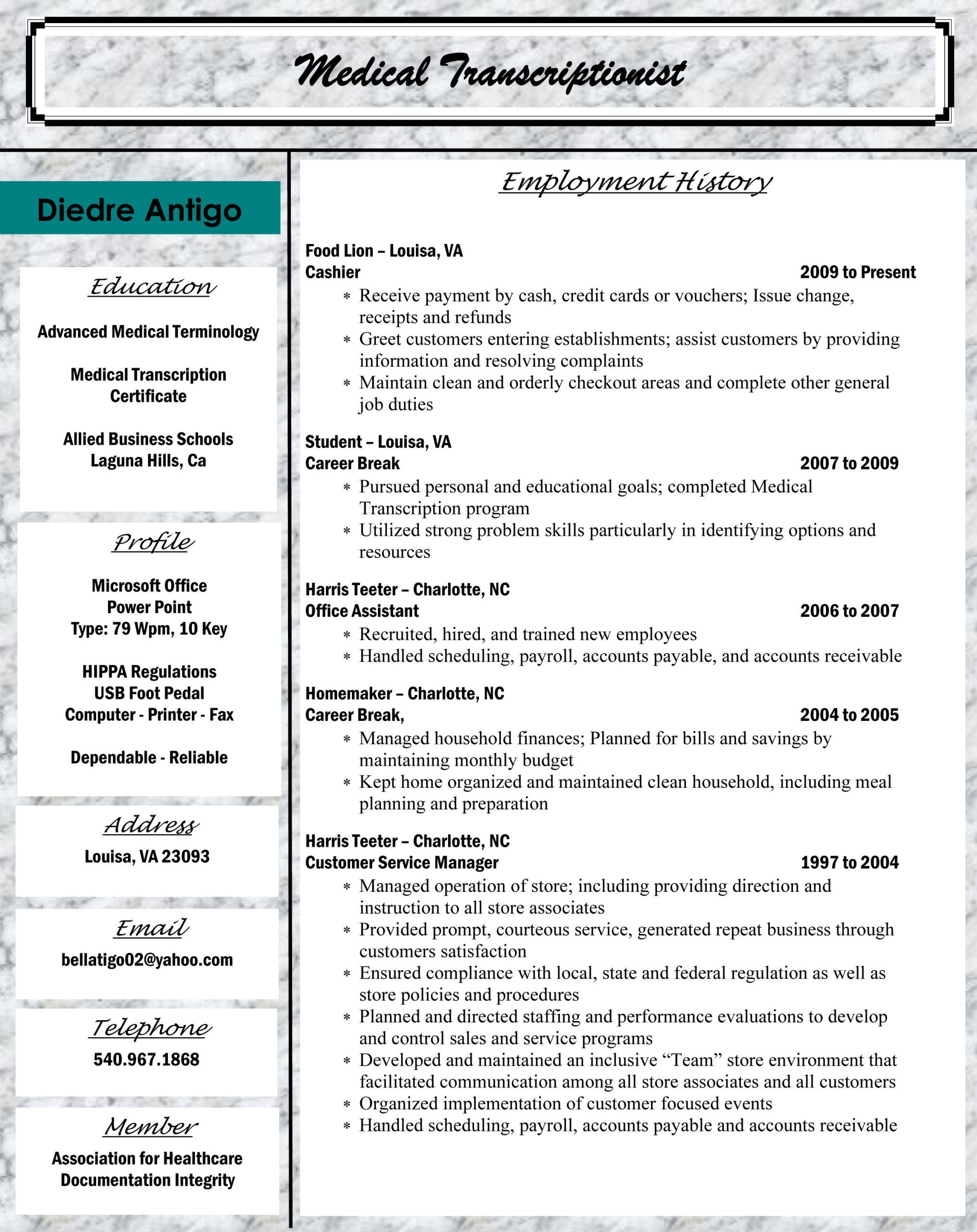 Back To Sample Resume Objectives for Medical Transcriptionist