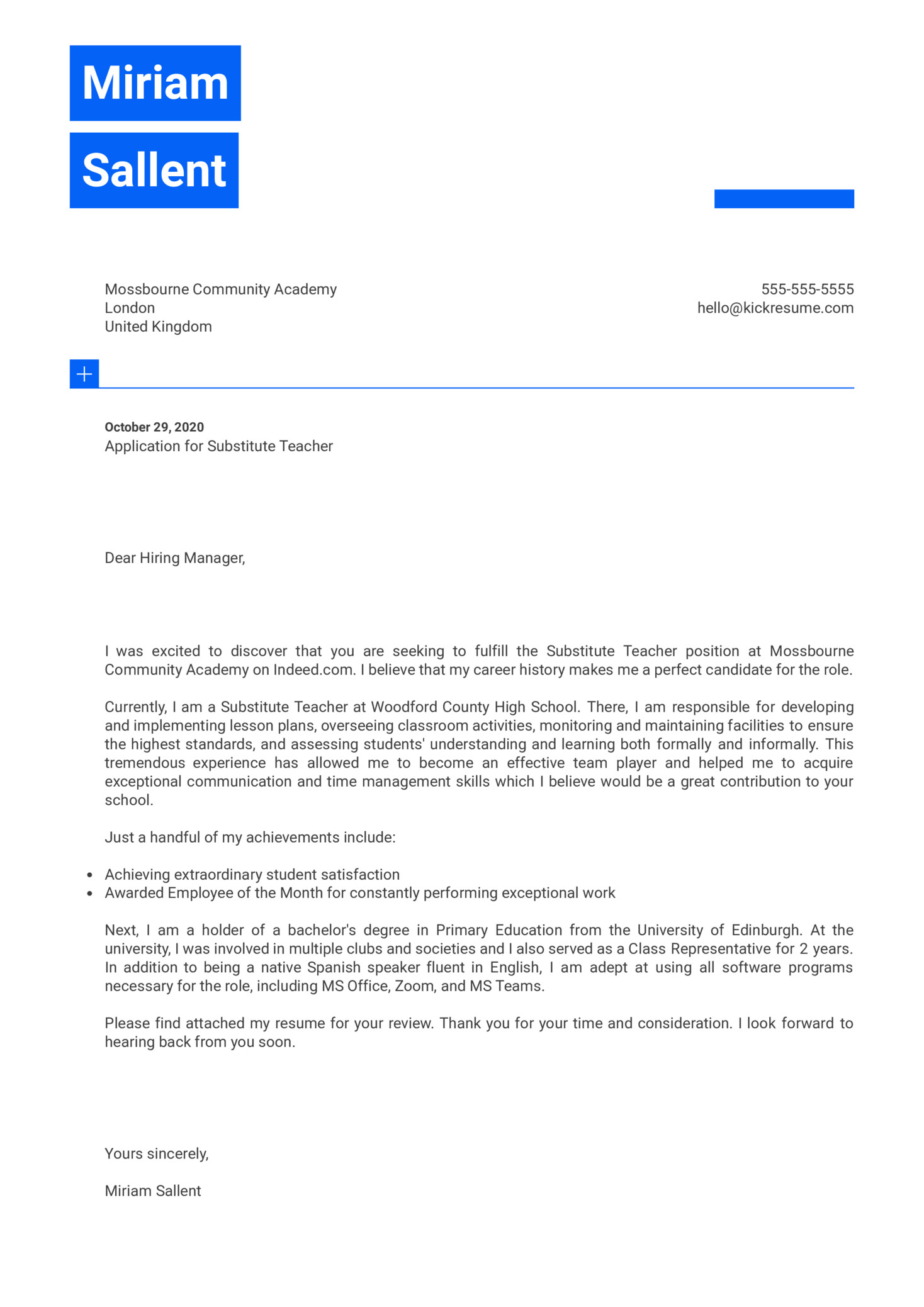 Sample Substitute Teacher Resume Cover Letter Substitute Teacher Cover Letter Sample and all other pictures, designs or photos on our website are copyright of their respective owners. we get our pictures from another websites, search engines and other sources to use as an inspiration for you. please contact us if you think we are infringing copyright of your pictures using contact page. we will be very happy to help you.