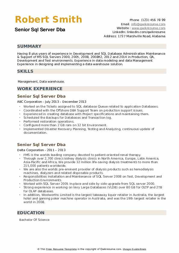 Sql Dba Sample Resumes for Experienced Senior Sql Server Dba Resume Samples and all other pictures, designs or photos on our website are copyright of their respective owners. we get our pictures from another websites, search engines and other sources to use as an inspiration for you. please contact us if you think we are infringing copyright of your pictures using contact page. we will be very happy to help you.