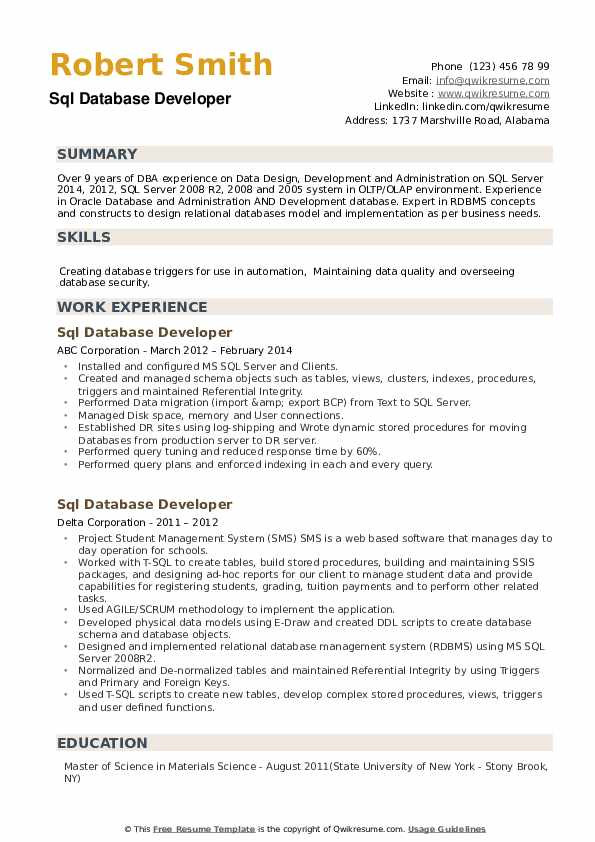 Sql Server Database Developer Resume Sample Sql Database Developer Resume Samples and all other pictures, designs or photos on our website are copyright of their respective owners. we get our pictures from another websites, search engines and other sources to use as an inspiration for you. please contact us if you think we are infringing copyright of your pictures using contact page. we will be very happy to help you.