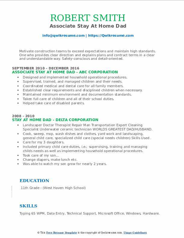 Stay at Home Dad Resume Sample Stay at Home Dad Resume Samples and all other pictures, designs or photos on our website are copyright of their respective owners. we get our pictures from another websites, search engines and other sources to use as an inspiration for you. please contact us if you think we are infringing copyright of your pictures using contact page. we will be very happy to help you.