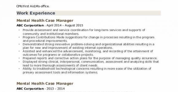 Mental Health Case Manager Resume Sample - A resume is a formal document that contains a summary of relevant play a part experience and education and is usually created for the object of obtainin...