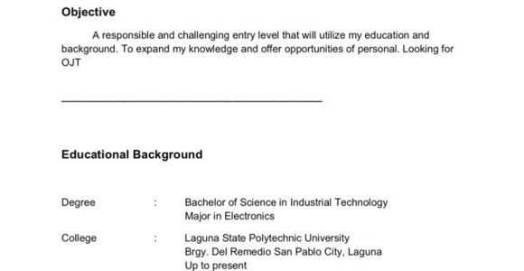 Sample Of Objectives In Resume for Ojt - A resume is a formal document that contains a summary of relevant fake experience and education and is usually created for the ambition of obtaining a job...