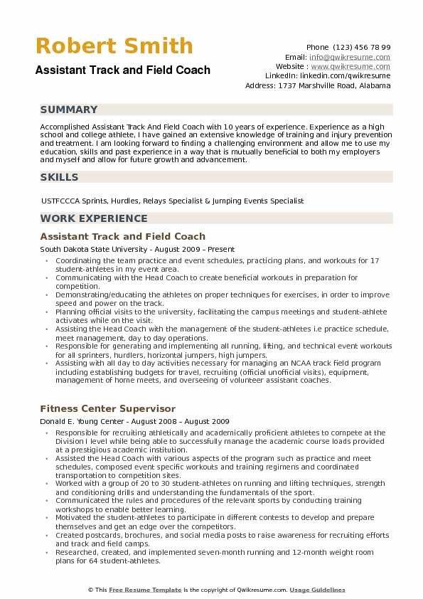 Track and Field Coach Resume Sample assistant Track and Field Coach Resume Samples and all other pictures, designs or photos on our website are copyright of their respective owners. we get our pictures from another websites, search engines and other sources to use as an inspiration for you. please contact us if you think we are infringing copyright of your pictures using contact page. we will be very happy to help you.